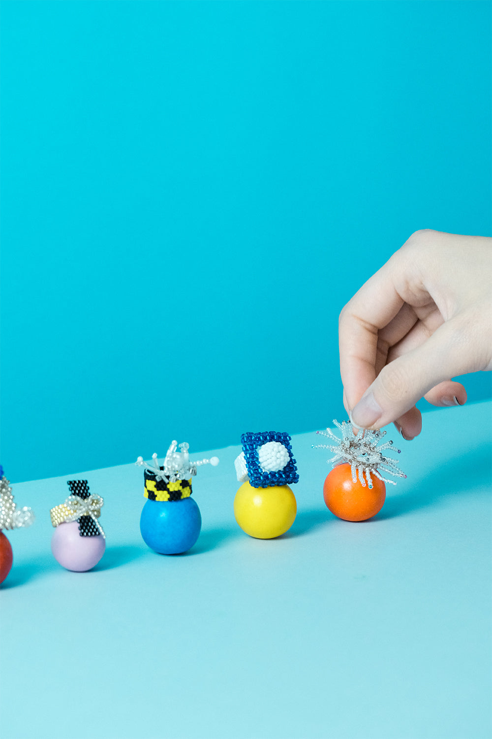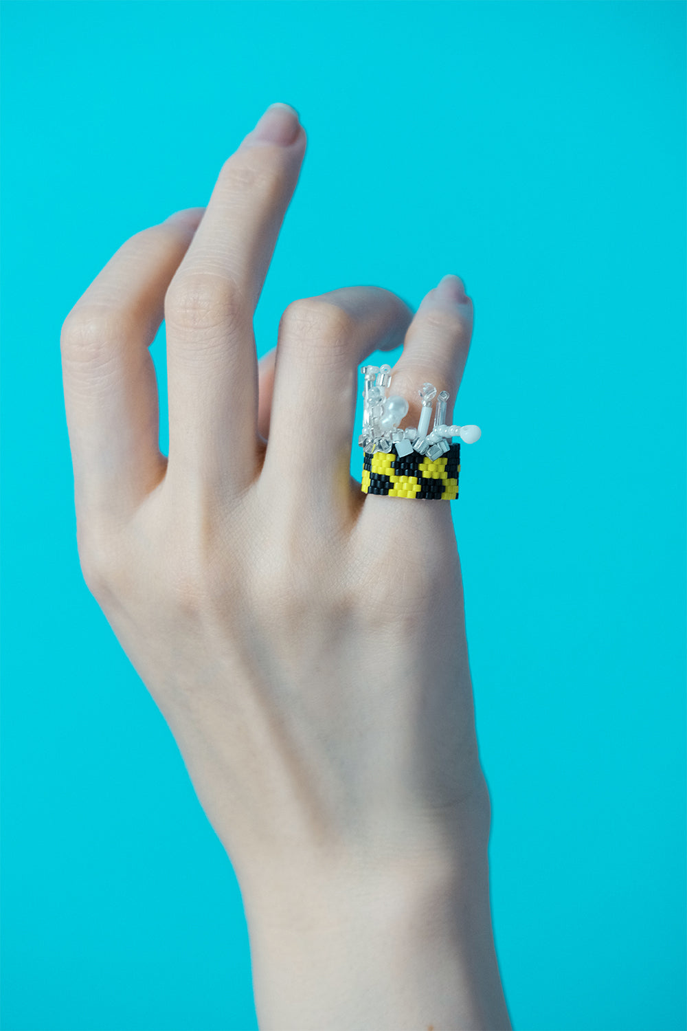 The ring features a striking black and yellow checkerboard pattern, which adds a bold and eye-catching element to the design. This pattern is reminiscent of the colors of a honeycomb, which adds a touch of natural beauty to the overall aesthetic. The combination of the checkerboard pattern and decorative beads creates a sense of buzzing energy that is truly captivating.