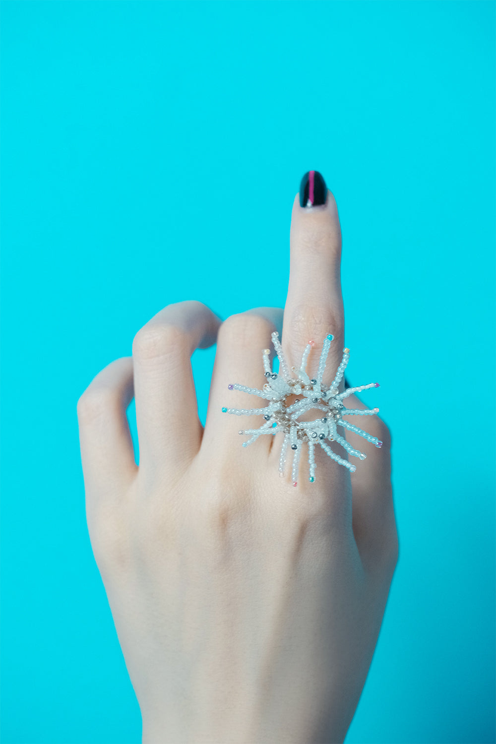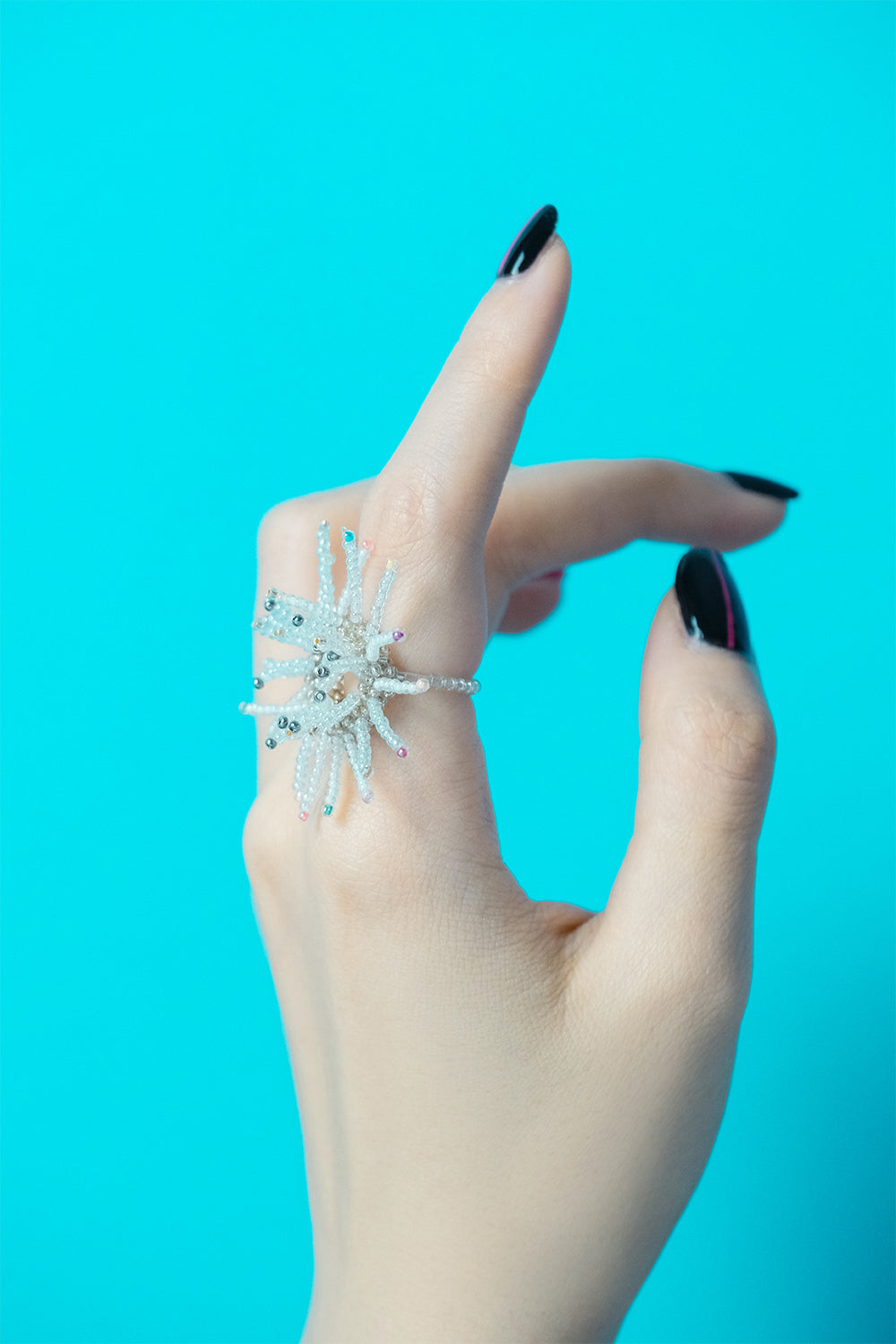 This ring features a sleek and elegant silver round that serves as the perfect backdrop for the stunning burst of white tassels that bloom from the ring. At the top of each tassel, you will find colorful dots that add an eye-catching and playful touch to the ring. These dots are carefully arranged to mimic the vibrant colors of a fireworks display, creating a mesmerizing effect that will draw compliments and attention.